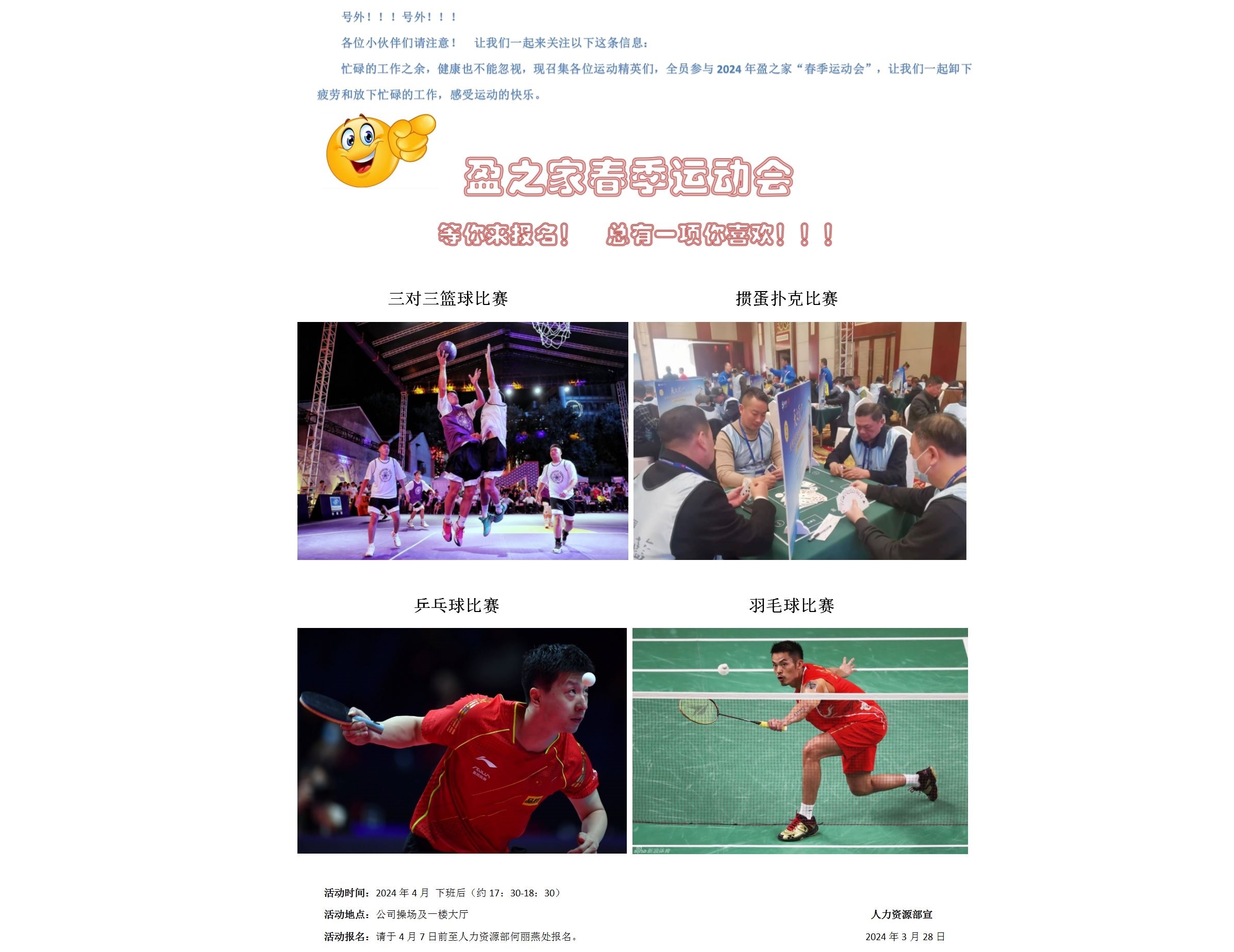 忙碌的工作之余,健康也不能忽視,現(xiàn)召集各位運動精英們,全員參與 2024 年盈之家“春季運動會”,讓我們一起卸下疲勞和放下忙碌的工作,感受運動的快樂。